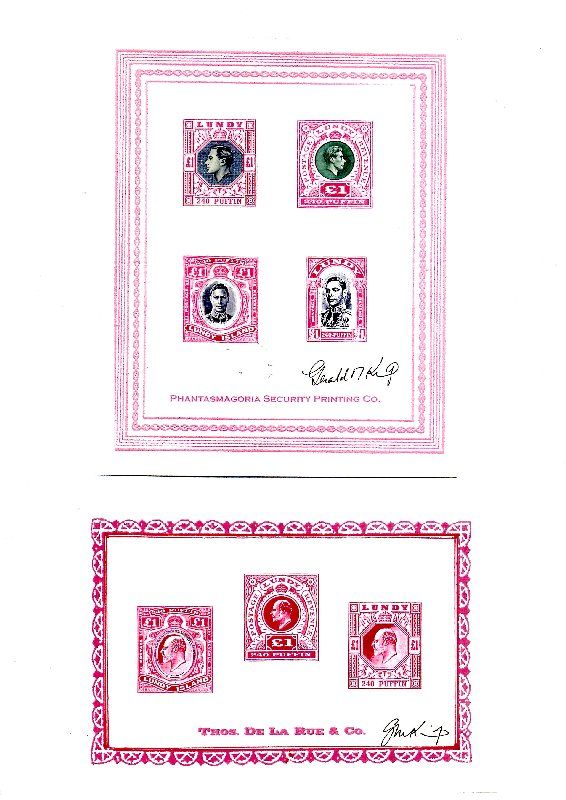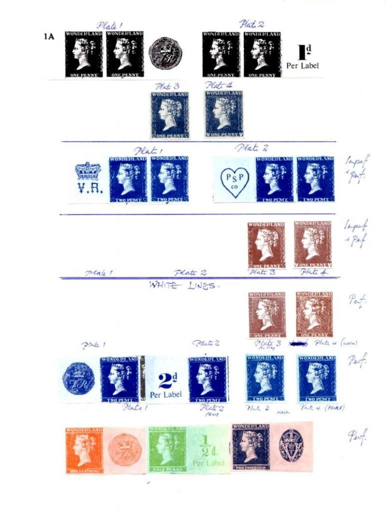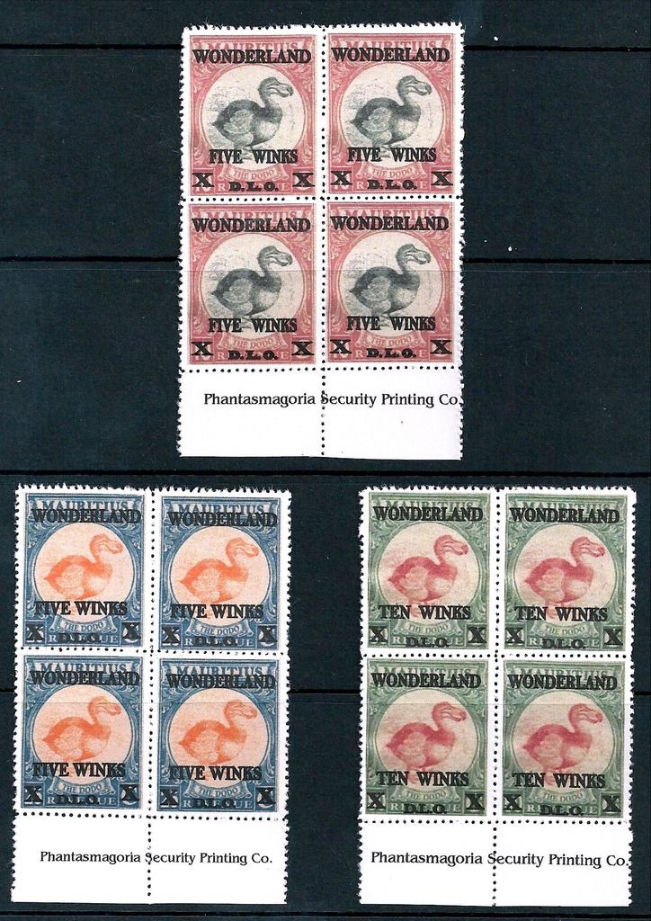 That red stamp has been in my collection for domkey's years. I had it it before I became aware of Gerald King's Wonderland stamps. On;y then could I place it somewhere. I did contact Gerry about it, but he had no recollections about it, though he did say that he experimented a bit in the earliest days of Wonderland stamp. However they must be his creations. These have denominations in Winks and Golden Slumbers, the currency that Gerry's Wonderland stamps changed to in 1865. Could two stamp producers have come up with the same obscure currency? The only other remote possibility is that someone else did produce these, some came by Gerry, and he subconsciously absorbed Winks and Golden Slumbers, and use them later. On the whole I think these must be Gerald King's first Wonderland stamps.